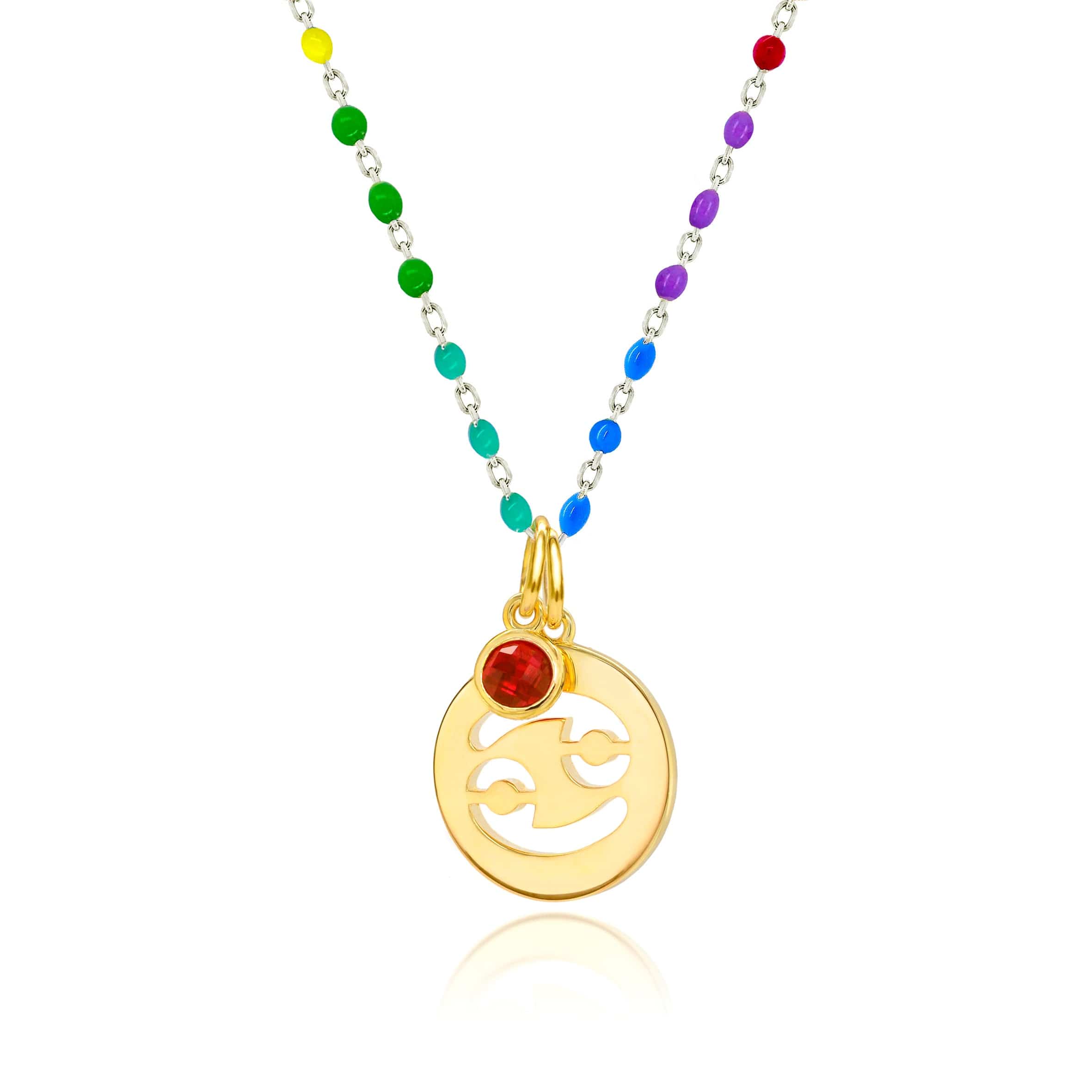 Crafted from 925 Sterling Silver and gold plated for the bold effect, the Zodiac pendants are exotic and beautiful. Each pendant features a different Zodiac symbol hammered out in a circular, flat shape for the elegant effect, and is suspended on a multi-hues enamel chain. Paired with a small but sparkling synthetic birthstone to match your birth date, this necklace makes the perfect birthday gift.